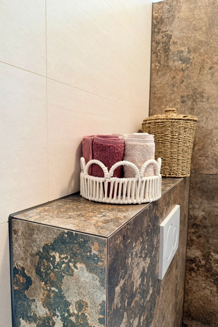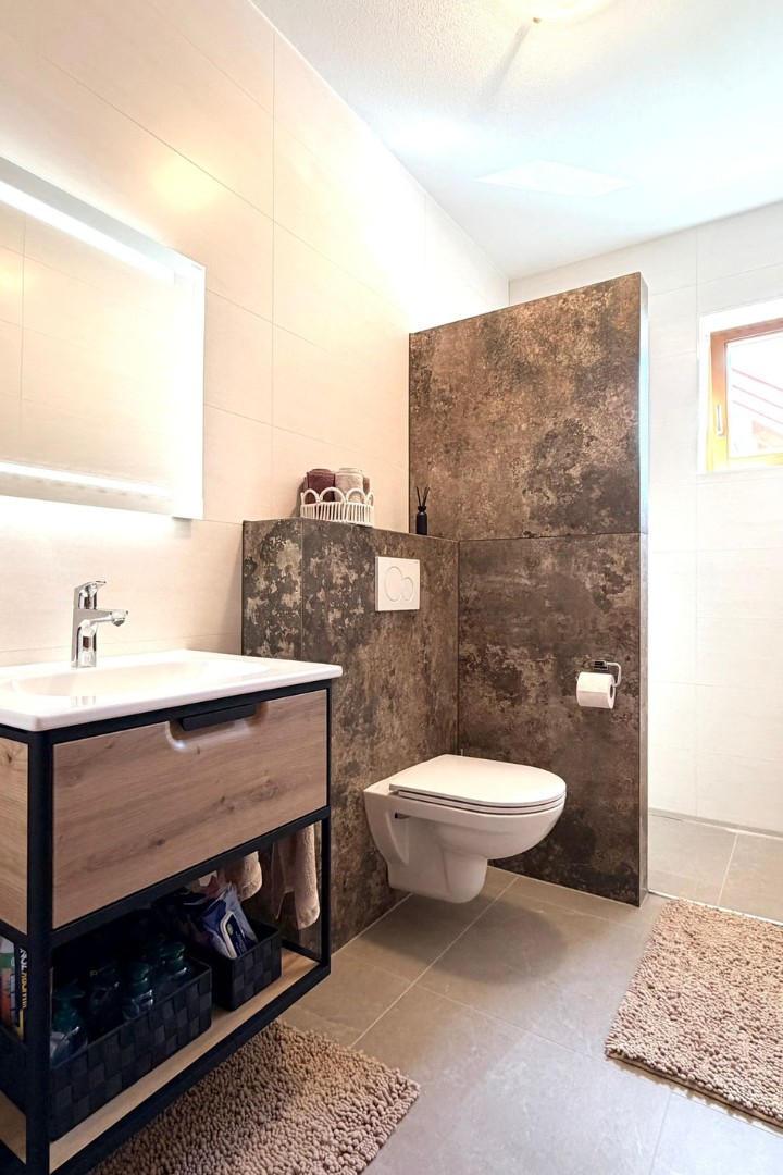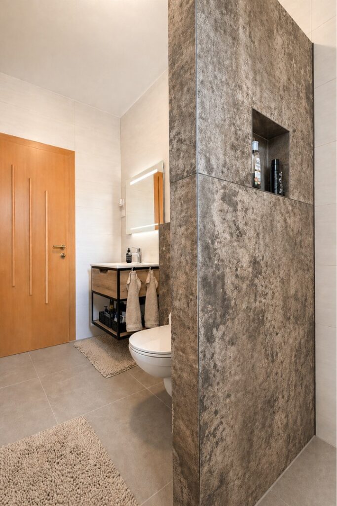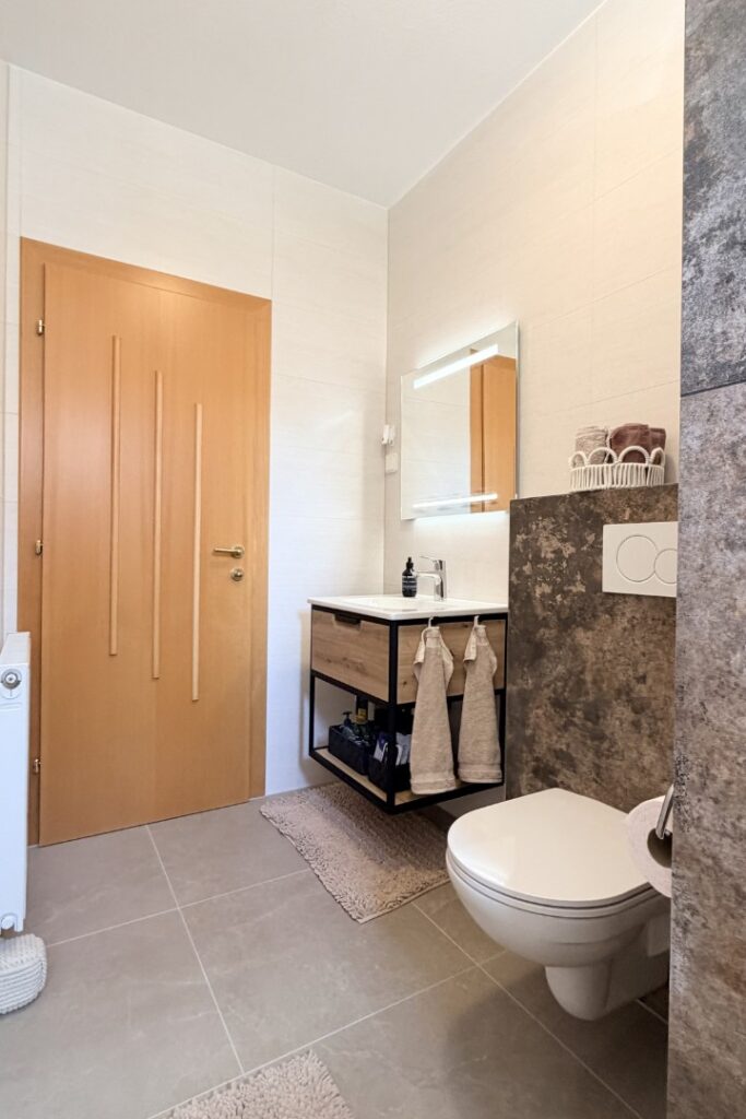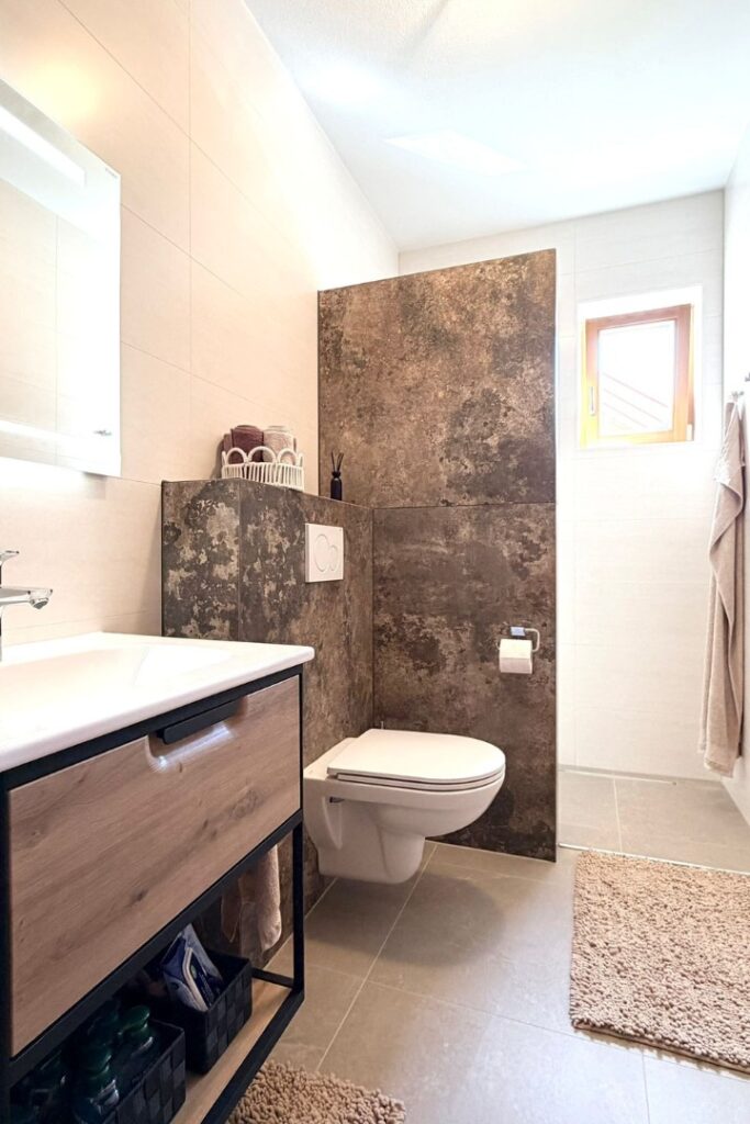 Modernes Badezimmer nach Badsanierung in Oberwart mit XXL-Fliesen und sauber ausgeführten Gehrungskanten