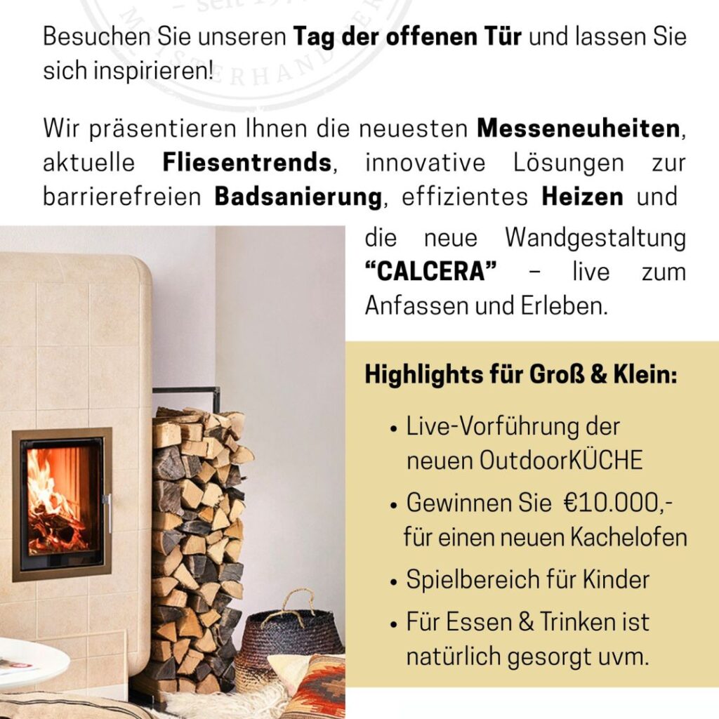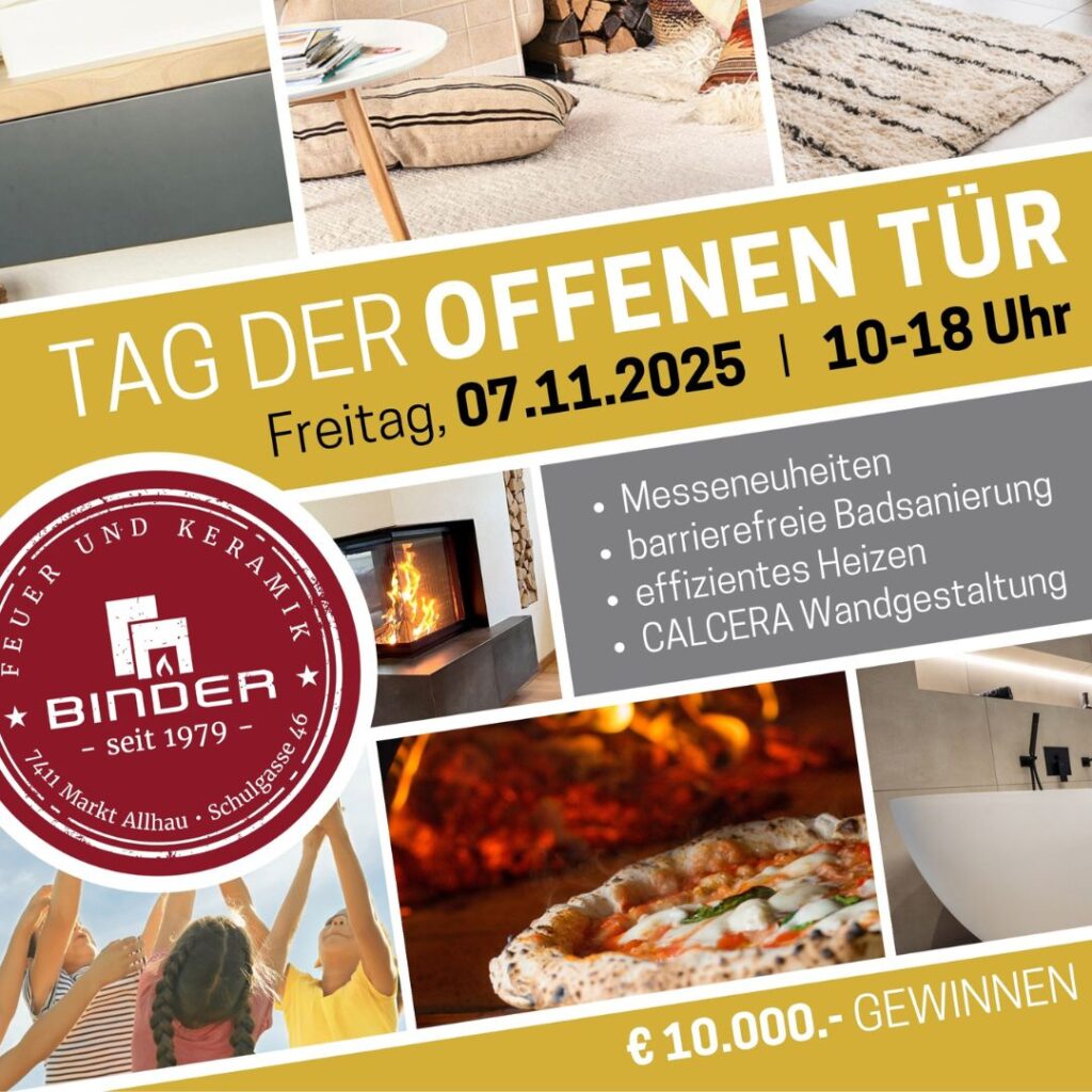 Am Freitag, den 7. November 2025, ist es wieder so weit: Wir öffnen, anlässlich des „Tag des Kachelofens“, unsere Türen in Markt Allhau und laden Sie herzlich zu einem erlebnisreichen Tag rund um Wärme, Design und Innovation ein. Zwischen 10 und 18 Uhr erwartet Sie ein spannendes Programm für Groß und Klein!